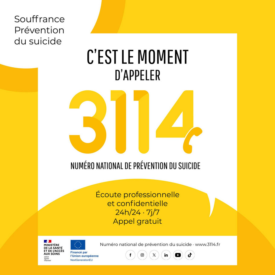 Le 3114 est le numéro national de prévention du suicide. Il est gratuit, professionnel, ouvert 7j/7 et 24h24. Au bout du fil, ce sont des professionnels du soin, psychologues ou infirmiers, spécifiquement formés. 18 centres de réponse sont actuellement répartis sur l’ensemble du territoire afin d’apporter un recours professionnel à l’ensemble de la population.