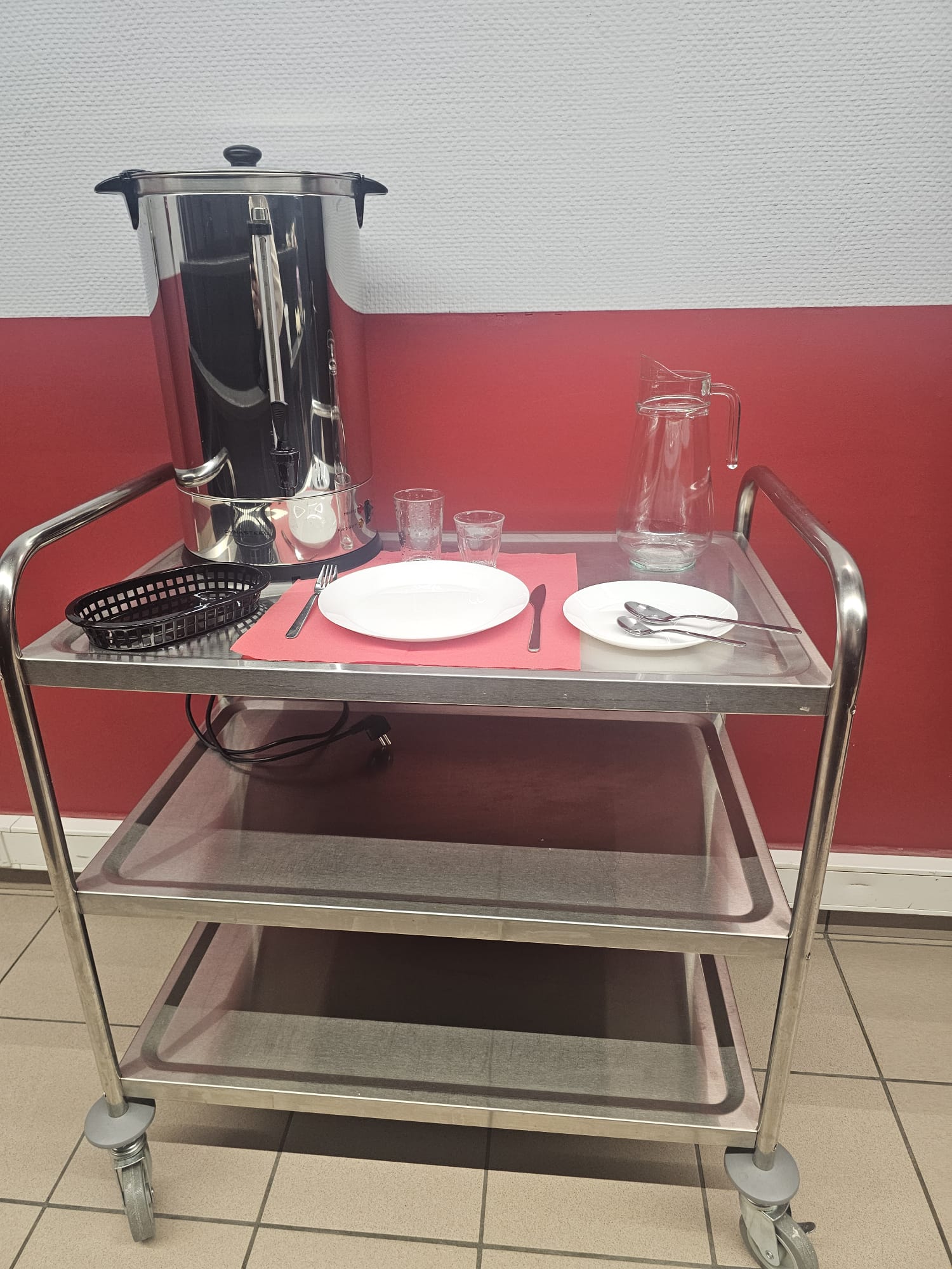 Petites et grandes assiettes, couverts, verres, pichets, panières à pain, percolateur, ...